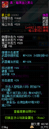 | 80 | 真·暗黑血之黑云 | *设计图(70LV以上普通地下城 登场的NPC加百利 出售) *暗黑血之黑云 → 用远古神器装备进化书升级(NPC船长鲁特 出售) |