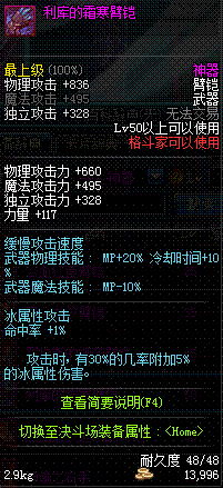 | 50 | 利库的霜寒臂铠 | *寒冰巨人利库 掉落(地下城: 黑色雪山) *在NPC敏泰的物品店购买(阿拉德陨石×285) |