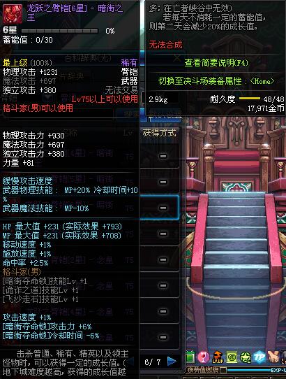 | 75 | 龙跃之臂铠[6星] - 暗街之王 | *完成二次觉醒任务后可以从NPC小铁柱处获得此道具。 | ||