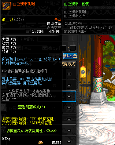 | 85 | 血色残阳礼帽 | *昨日之巴斯顿 掉落 (在远古地下城里出没。) *从NPC鲁特的物品店出售的[血色残阳特殊装备礼盒]中获得 *船长鲁特 出售 (气吞山河图×800) |