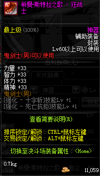 | 鬼剑士 | 神枪手 | 格斗家 | 魔法师 | 圣职者 | 暗夜使者 | 布甲 | 皮甲 | 重甲 | 轻甲 | 板甲 | 饰品 |