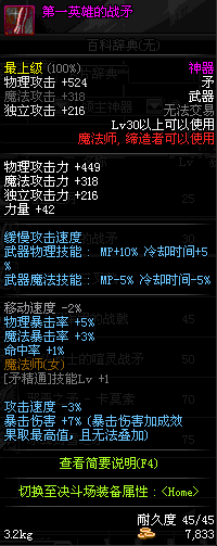 | 30 | 第一英雄的战矛 | *精灵骑士隆美尔 掉落(英雄冢) *在NPC克伦特的物品店购买(阿拉德陨石×105) |