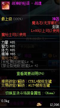 | 辅助装备: | 全职业 鬼剑士 女鬼剑 女格斗 男格斗 神枪手 女枪手 魔法师 男法师 圣职者 暗夜使者 守护者 |