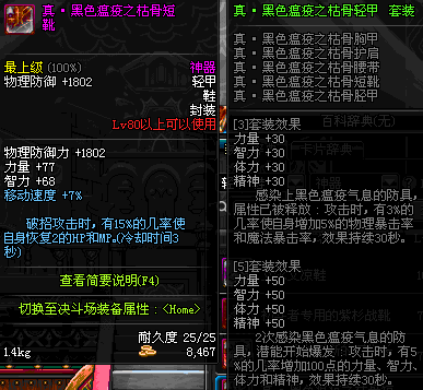 | 80 | 真 · 黑色瘟疫之枯骨短靴 | *设计图(70LV以上普通地下城 登场的NPC加百利 出售) *黑色瘟疫之枯骨短靴 → 用远古神器装备进化书升级(NPC船长鲁特 出售) |