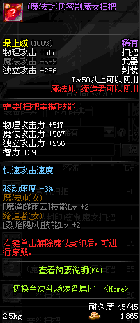 | 50 | (魔法封印)密制魔女扫把 | *Lv50~56普通地下城怪物掉落 *完成[黑色噩梦投影出来的世界]任务 *使用Lv50~56怪物掉落的设计图进行制作 |