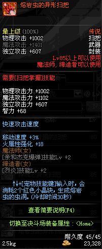 | 85 | 熔岩虫的异形扫把 | *熔岩怪虫 掉落(地下城: 能量阻截战 10图) *设计图(地下城 能量阻截战 登场的NPC加百利 出售) |