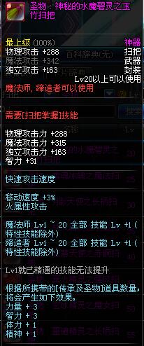 | 20 | 圣物 : 神秘的水魔碧灵之玉竹扫把 | *Lv19~26普通地下城怪物掉落 | ||