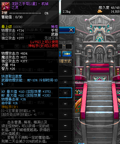 | 75 | 龙跃之手弩[6星] – 机械之灵 | *完成二次觉醒任务后可以从NPC小铁柱处获得此道具。 | ||