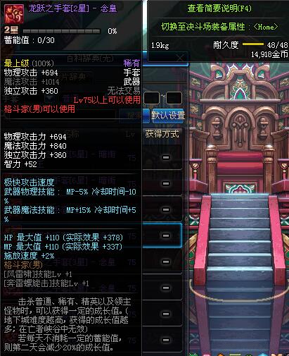 | 75 | 龙跃之手套[4星] - 念皇 | *完成二次觉醒任务后可以从NPC小铁柱处获得此道具。 | ||