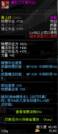 | 55 | 霜权之艾佛尔剑 | *Lv53~61普通地下城怪物掉落 *在加百利的神秘商店购买 |