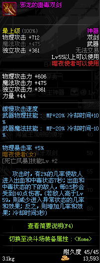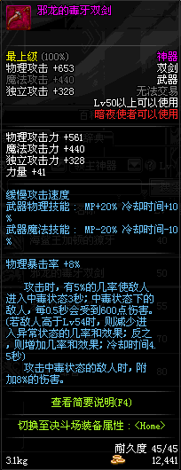 | 50 | 邪龙的毒牙双剑 | *邪龙斯皮兹头部 掉落(暮色之城) *在NPC敏泰的物品店购买(阿拉德陨石×285) |