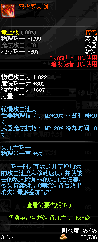 | 85 | 双火焚天剑 | *炽炎之艾格尼丝 掉落(地下城:擎天之柱 5图) *设计图(擎天之柱 登场的NPC加百利 出售) |