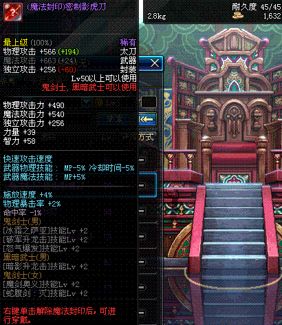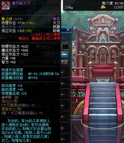 | 45 | (魔法封印)密制大蛇刀 | *Lv45~51普通地下城怪物掉落 *完成[罗斯特的破绽]任务 *使用Lv45~51怪物掉落的设计图进行制作 |