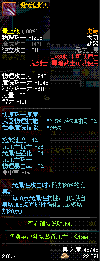 | 80 | 明光追影刀 | *雷剑艾利撒 掉落(在能源中心地区的深渊地下城出没。) | * 光属性 | |