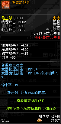 | 60 | 蛮荒之预言 | *Lv59~66深渊地下城怪物掉落 *攻坚队完成安徒恩团队模式的[讨伐安徒恩]任务时,获得的奖励。 *从NPC沉默之克雷娅的物品店购买 |