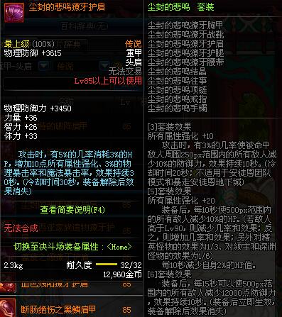 | 85 | 断肠绝伤之黑鳞肩甲 | *昨日之巴斯顿 掉落 (在远古地下城里出没。) *从NPC鲁特的物品店出售的[断肠绝伤防具礼盒]中获得 |