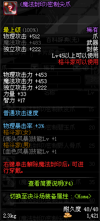 | 45 | (魔法封印)密制尖爪 | *Lv45~51普通地下城怪物掉落 *完成[罗斯特的破绽]任务 *使用Lv45~51怪物掉落的设计图进行制作 |