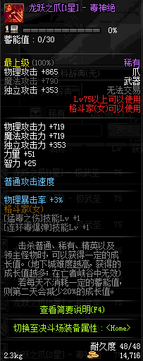 | 75 | 龙跃之爪[1星] - 毒神绝 | *完成二次觉醒任务后可以从NPC小铁柱处获得此道具。 | ||