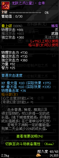 | 75 | 龙跃之爪[2星] - 念皇 | *完成二次觉醒任务后可以从NPC小铁柱处获得此道具。 | ||