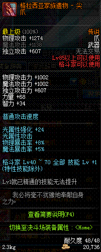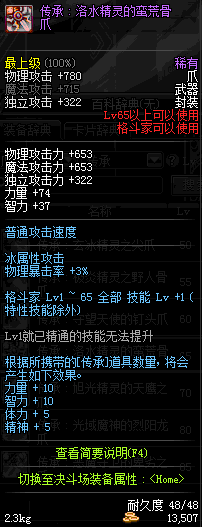 | 65 | 圣物 : 洛水精灵的蛮荒骨爪 | *Lv65~71普通地下城怪物掉落 |