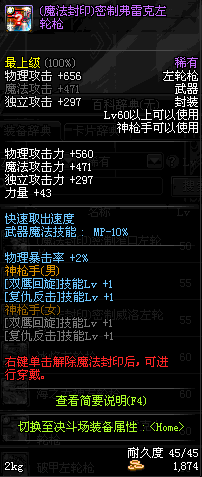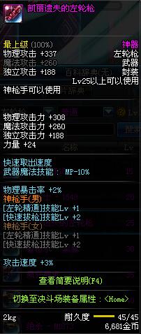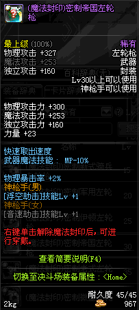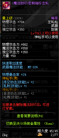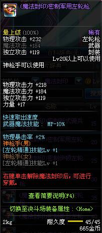 | 45 | (魔法封印)密制转轮手枪 | *Lv45~51普通地下城怪物掉落 *完成[罗斯特的破绽]任务 *使用Lv45~51怪物掉落的设计图进行制作 |