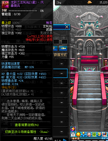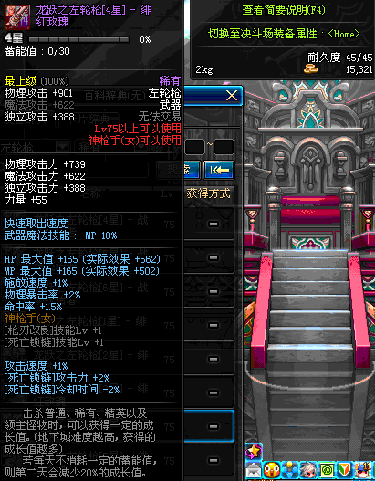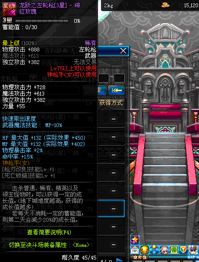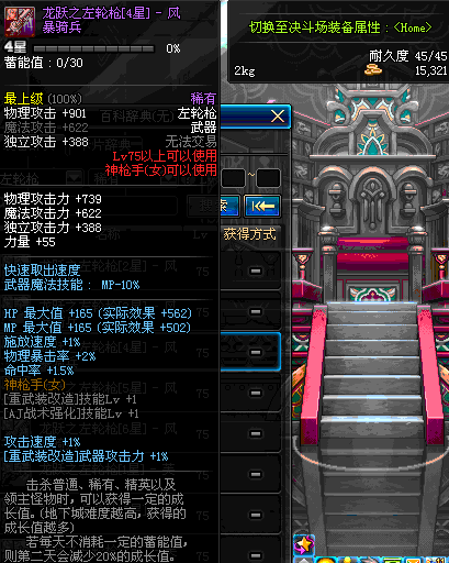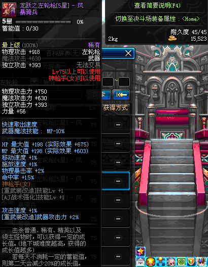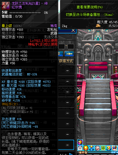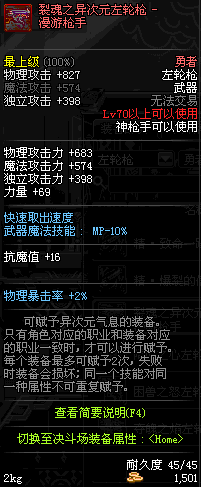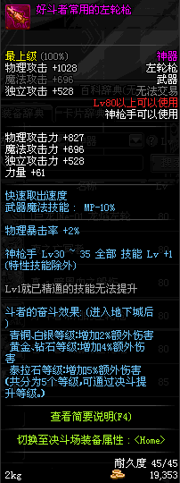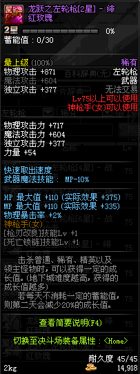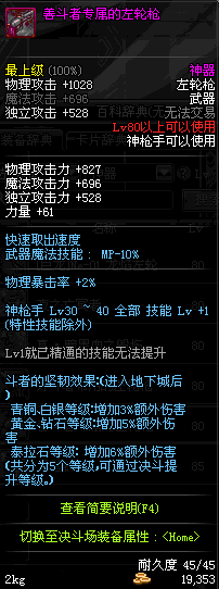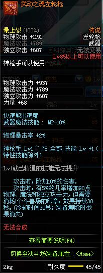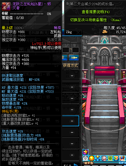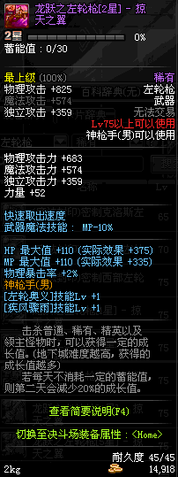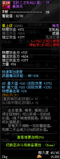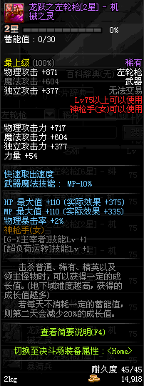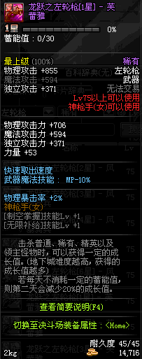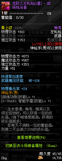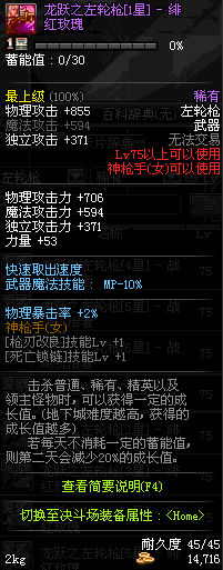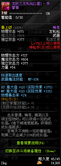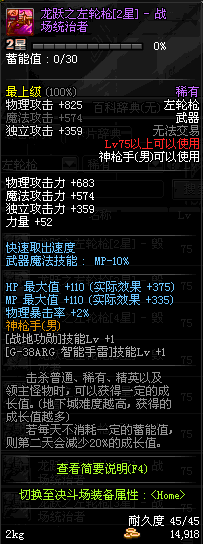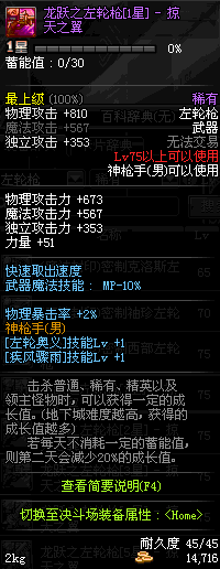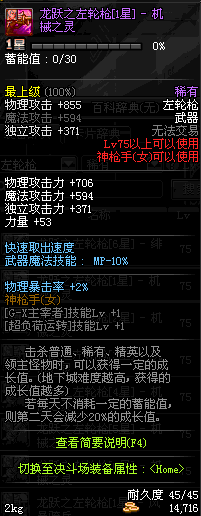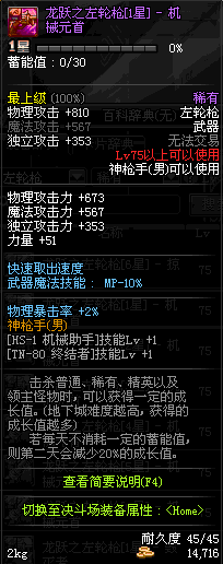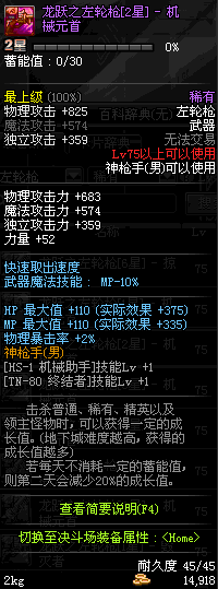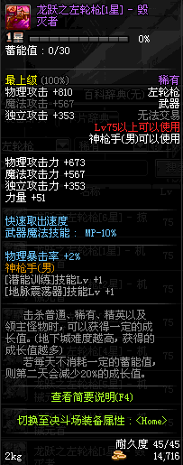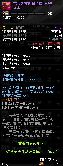 | 75 | 龙跃之左轮枪[2星] – 毁灭者 | *完成二次觉醒任务后可以从NPC小铁柱处获得此道具。 | ||